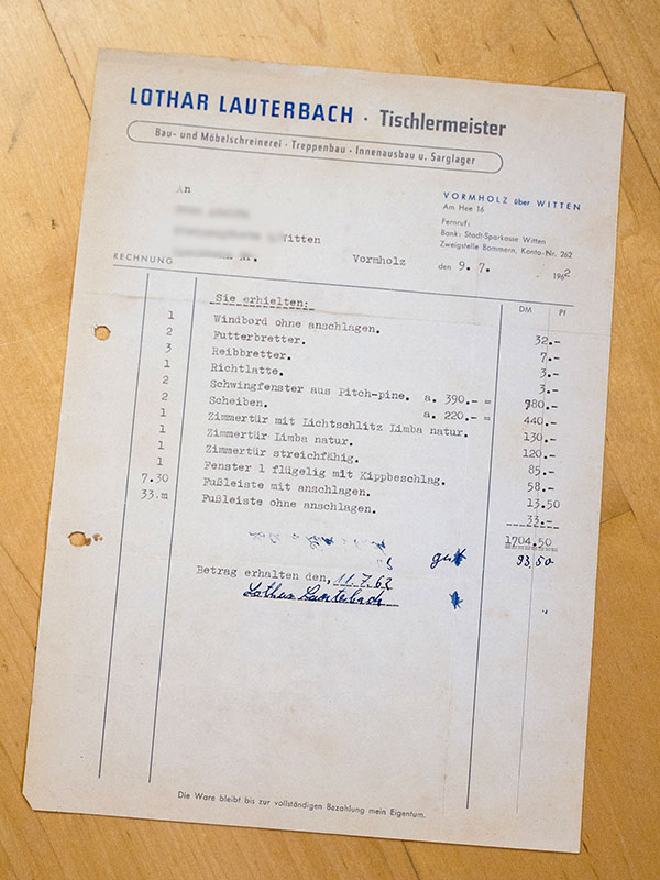 | April 1960 | Gründung der Schreinerei mit Bestattungshaus durch Herrn Lothar Lauterbach Eintragung bei der Handwerkskammer Firmensitz an der Rauendahlstraße in den „sieben Kurven“, Witten-Bommern |